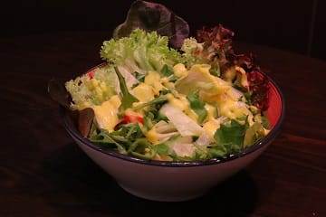 Knuspriges Hähnchenfilet, Salat, Gewürzgurken, Paprika-Chutney oder wahlweise mit Coleslaw, Mayo